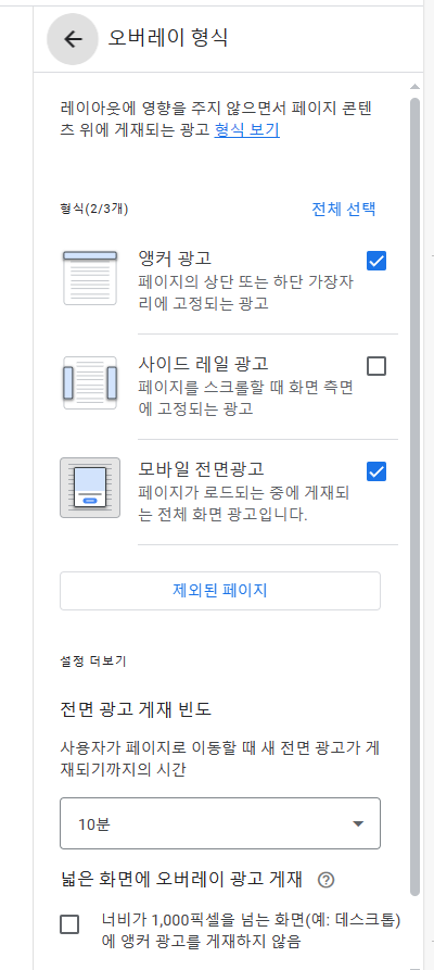 광고 유형 선택: 광고 제외 설정 페이지에서 어떤 유형의 광고를 제외할지 선택하세요. 텍스트 광고, 디스플레이 광고, 링크 유닛 등을 개별적으로 선택할 수 있습니다.