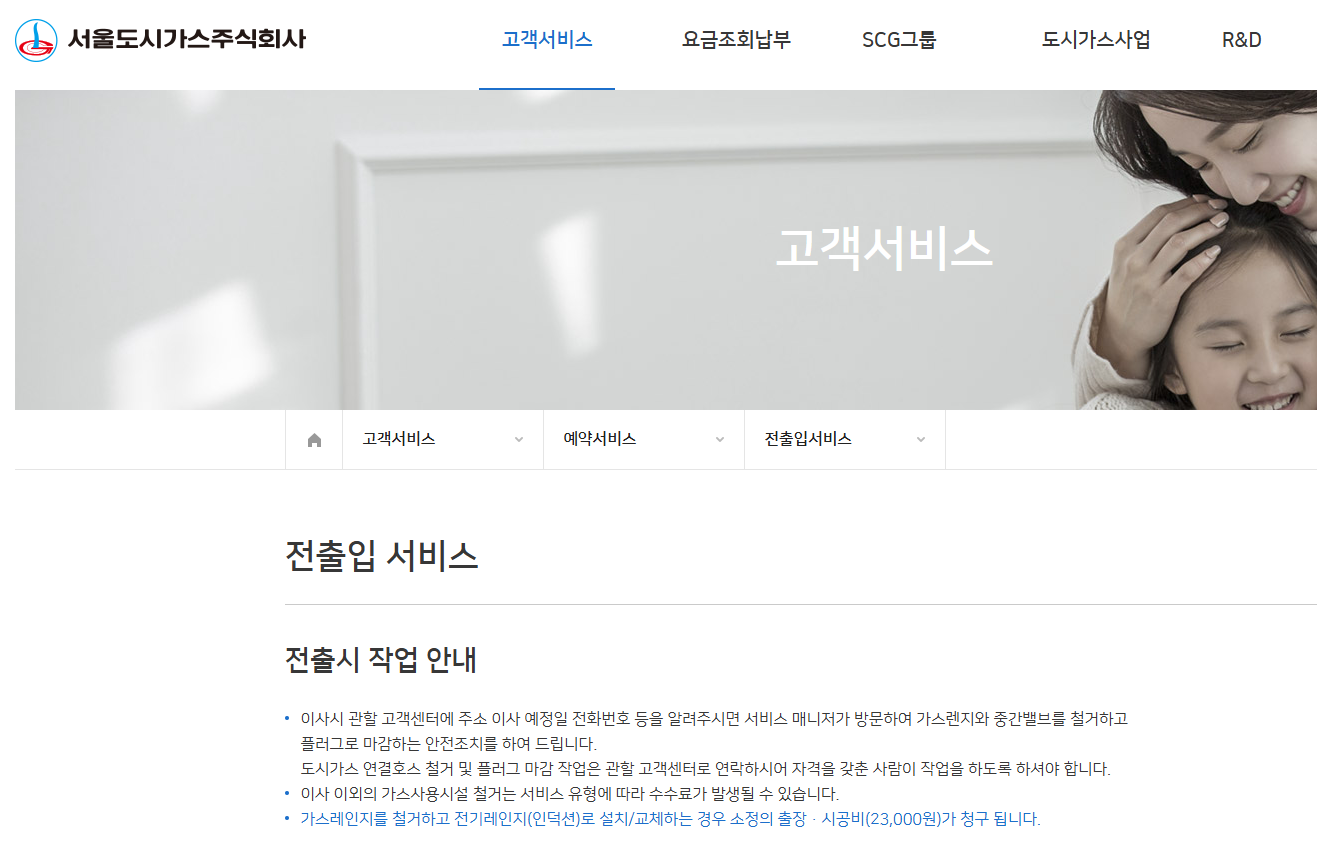 - 이사시 관할 고객센터에 주소 이사 예정일 전화번호 등을 알려주시면 서비스 매니저가 방문하여 가스렌지와 중간밸브를 철거하고