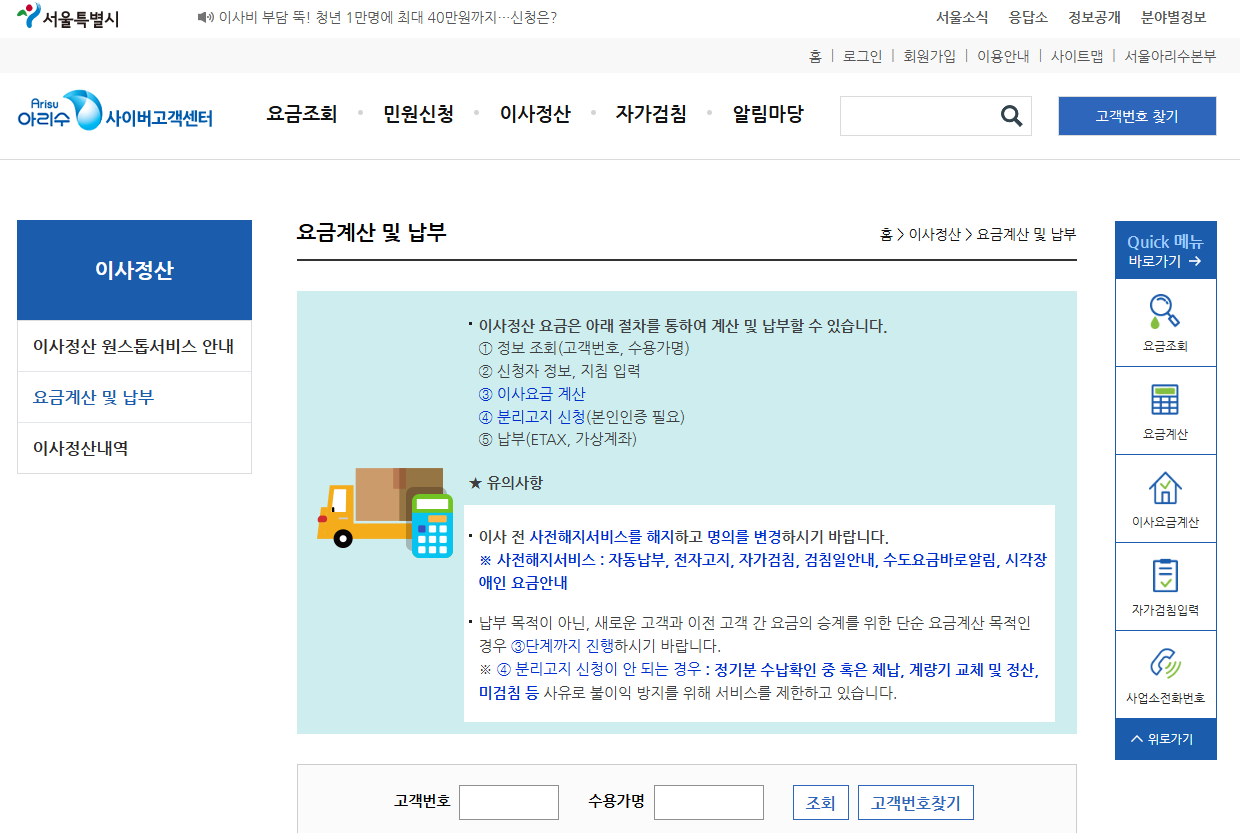 | 수도요금 | 해당 지역 상수도사업본부 문의 (지자체 운영) | 예) 서울: 120 다산콜 또는 http://arisu.seoul.go.kr |