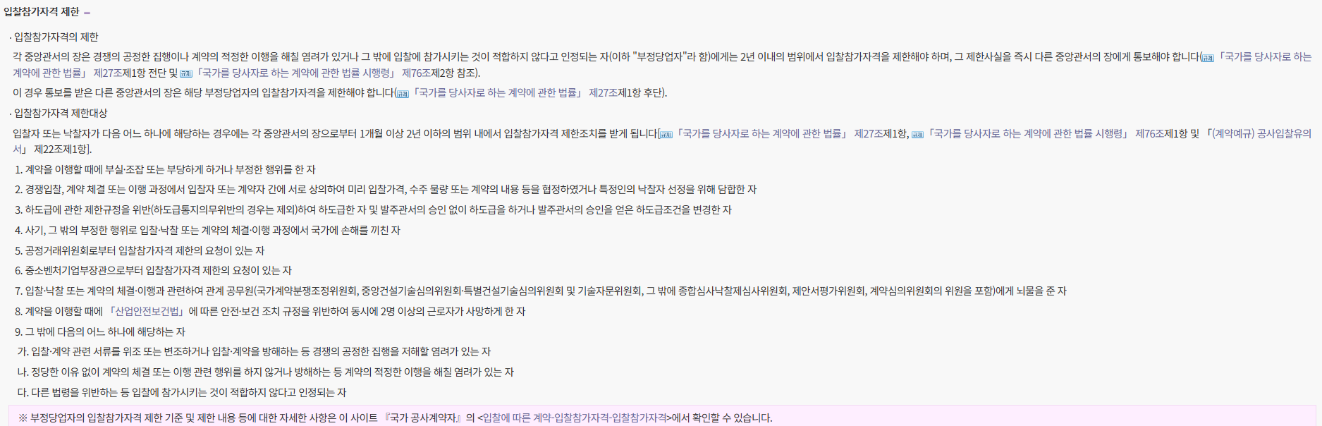 1. 계약을 이행할 때에 부실·조잡 또는 부당하게 하거나 부정한 행위를 한 자2. 경쟁입찰, 계약 체결 또는 이행 과정에서 입찰자 또는 계약자 간에 서로 상의하여 미리 입찰가격, 수주 물량 또는 계약의 내용 등을 협정하였거나 특정인의 낙찰자 선정을 위해 담합한 자3. 하도급에 관한 제한규정을 위반(하도급통지의무위반의 경우는 제외)하여 하도급한 자 및 발주관서의 승인 없이 하도급을 하거나 발주관서의 승인을 얻은 하도급조건을 변경한 자4. 사기, 그 밖의 부정한 행위로 입찰·낙찰 또는 계약의 체결·이행 과정에서 국가에 손해를 끼친 자5. 공정거래위원회로부터 입찰참가자격 제한의 요청이 있는 자6. 중소벤처기업부장관으로부터 입찰참가자격 제한의 요청이 있는 자7. 입찰·낙찰 또는 계약의 체결·이행과 관련하여 관계 공무원(국가계약분쟁조정위원회, 중앙건설기술심의위원회·특별건설기술심의위원회 및 기술자문위원회, 그 밖에 종합심사낙찰제심사위원회, 제안서평가위원회, 계약심의위원회의 위원을 포함)에게 뇌물을 준 자8. 계약을 이행할 때에 「산업안전보건법」에 따른 안전·보건 조치 규정을 위반하여 동시에 2명 이상의 근로자가 사망하게 한 자9. 그 밖에 다음의 어느 하나에 해당하는 자가. 입찰·계약 관련 서류를 위조 또는 변조하거나 입찰·계약을 방해하는 등 경쟁의 공정한 집행을 저해할 염려가 있는 자나. 정당한 이유 없이 계약의 체결 또는 이행 관련 행위를 하지 않거나 방해하는 등 계약의 적정한 이행을 해칠 염려가 있는 자다. 다른 법령을 위반하는 등 입찰에 참가시키는 것이 적합하지 않다고 인정되는 자※ 부정당업자의 입찰참가자격 제한 기준 및 제한 내용 등에 대한 자세한 사항은 이 사이트 『국가 공사계약자』의 <입찰에 따른 계약-입찰참가자격-입찰참가자격>에서 확인할 수 있습니다.