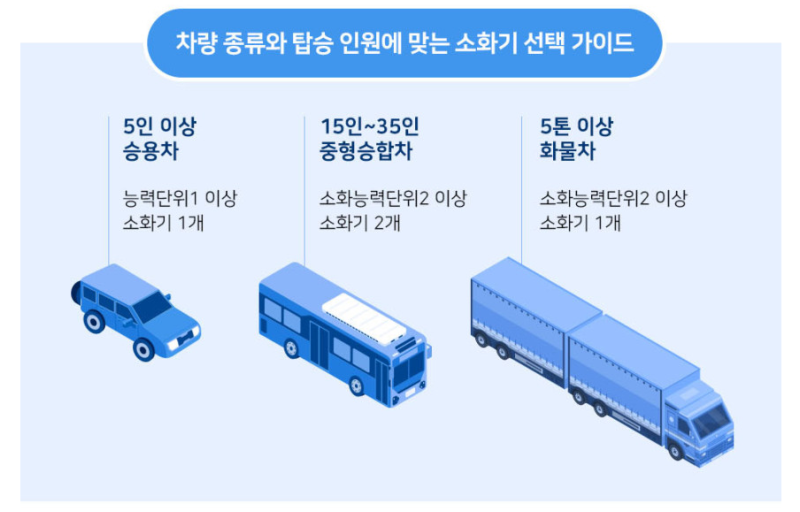 차량의 크기와 탑승 인원에 따라 필요한 소화기의 수량도 달라집니다. 예를 들어, 5인승 차량에는 1개의 소화기가 필요하며, 15인승 이상의 차량에는 2개가 필요합니다.